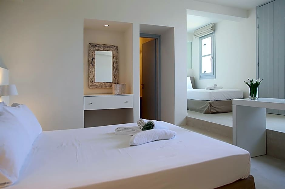 More spacious, this room enjoys Aegean Sea view from its 20-m2 private terrace. Elegantly decorated in white tones, it features: